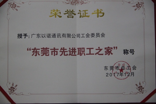 2018年1月12日,东莞市总工会向星空(中国)二级控股子公司广东以诺通讯有限公司工会颁发“东莞市先进职工之家”称号的证书及牌匾。以诺通讯工会充分发挥桥梁纽带作用,团结凝聚广大职工,推进企业发展。圆满完成了工会换届选举,定期召开工会会员代表座谈会,先后组织开展了《工会法》《劳动法》《劳动合同法》等法律法规讲座,协办东莞市大朗镇首届“迎新杯”企业足球赛等文体活动,作为基层工会优秀代表,应邀参加了2018年东莞市困难职工帮扶工作座谈会并作典型发言。