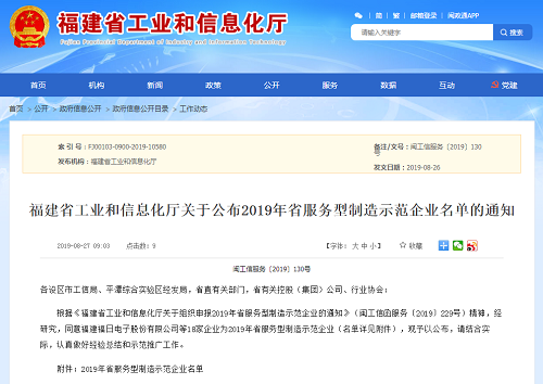 2019年8月26日,福建省工业和信息化厅公布了2019年省服务型制造示范企业名单,星空web版登录入口入选该名单。