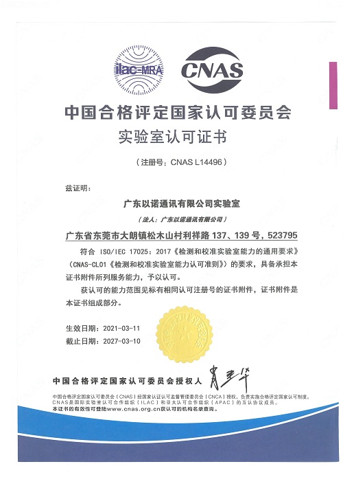 近日,星空(中国)二级控股子公司广东以诺通讯有限公司实验室获中国合格评定国家认可委员会(CNAS)颁发的实验室认可证书,标志其已具备相应的检测技术能力和管理能力,提升了数据的可信度和含金量,避免重复性检测,减少企业成本,提升公司整体形象和品牌价值。以诺通讯实验室将遵循“专业、严谨、诚信、创新”理念,积极拓展测试种类和试验项目,满足各类客户需求,持续提升公司实验室的专业水平。