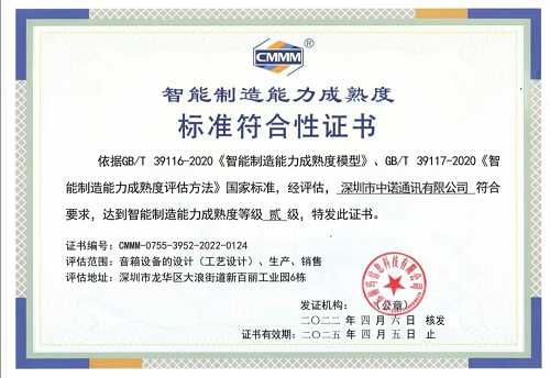 2021年9月-10月,由电子标准院授权江苏赫玛信息科技有限公司组建团队,基于GB/T 39116-2020《智能制造能力成熟度模型》、GB/T 39117-2020《智能制造能力成熟度评估方法》国家标准,对中诺通讯新百丽工业园从工厂设计、产品研发、工艺设计、计划与调度、生产作业、仓储配送、质量管控、设备管理、安全管控、能源管理、环保管理等20个能力子域的智能制造能力成熟度,通过人员交流、现场巡视、系统查看等方法进行评估,认定该公司智能制造能力成熟度达到贰级水平,得到国家认可。