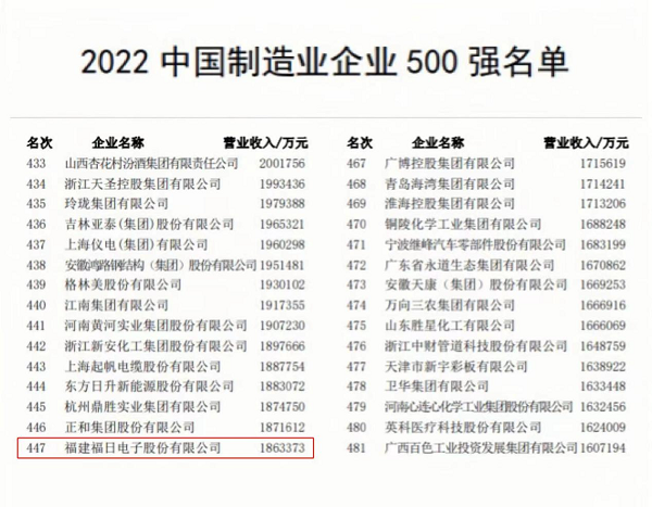 9月6日,中国企业联合会、中国企业家协会举行新闻发布会上,向社会发布了“2022中国企业500强”“2022中国制造业企业500强”“2022中国服务业企业500强”等各项榜单及其分析报告。其中,公司首次入围中国制造业企业500强,位列第447位。