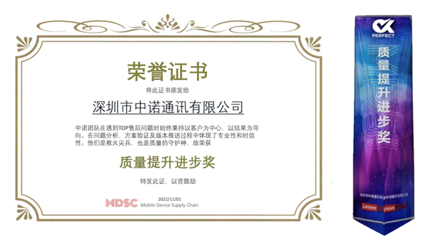 近日,2022年联想供应商质量论坛主题分享及年度颁奖在线上拉开帷幕,星空(中国)成员企业深圳市中诺通讯有限公司在线上出席了此次活动。“匠家技最巧,能工事尤精”,今年中诺项目的售后返修率TCRR指标满足目标要求并持续降低,在本次论坛中获得多次表扬,并荣获“联想2022年度质量提升进步奖”。